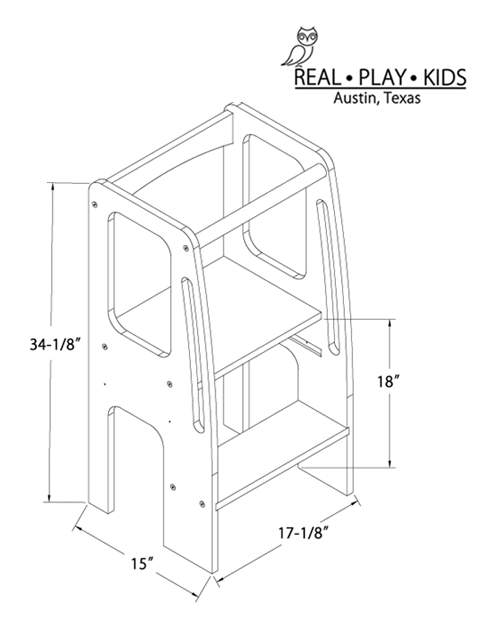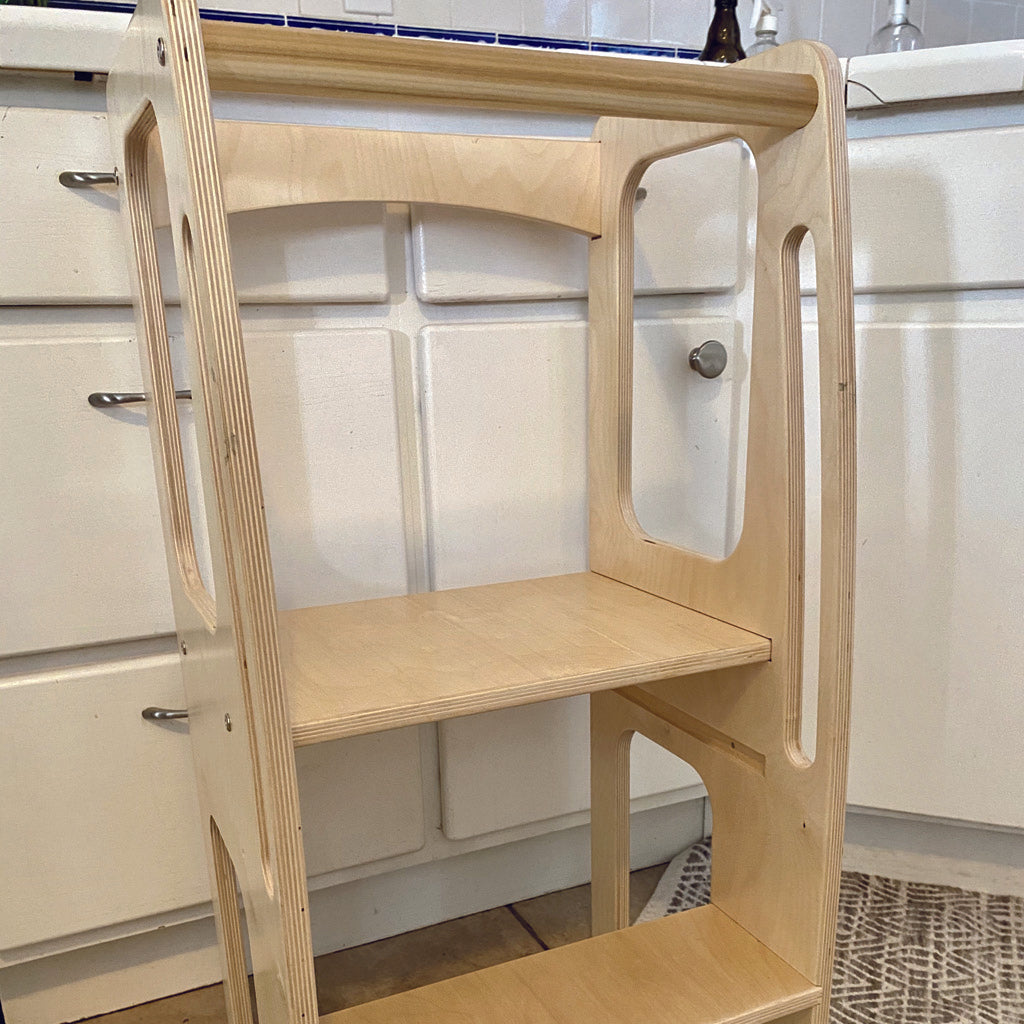 Our Learning Tower is designed and handcrafted in Austin, Texas, with high-quality materials, wood is Northern European Baltic Birch and we use Hardwood Poplar Dowels grown in Tennessee. All wood is FSC certified. The Learning Tower is finished with a clear Low-VOC water-based, ecologically friendly finish.