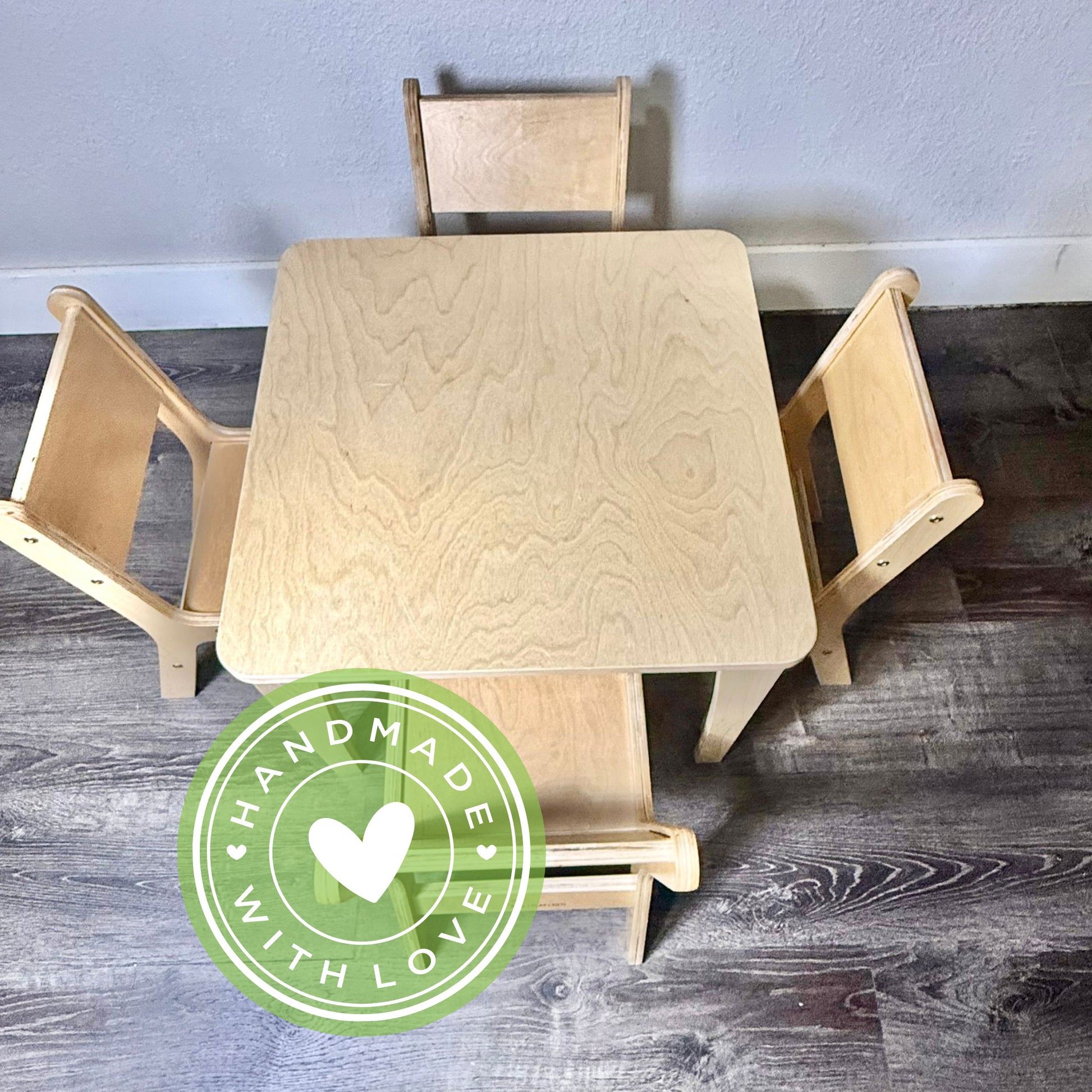 This handcrafted wooden kids table and chair set provides your little ones the perfect space to learn, play, and create a modern, Montessori-inspired design ideal for toddlers, homeschool spaces, Waldorf playrooms, and daycare classrooms. We build this sturdy wooden furniture to last through years of creativity and fun.