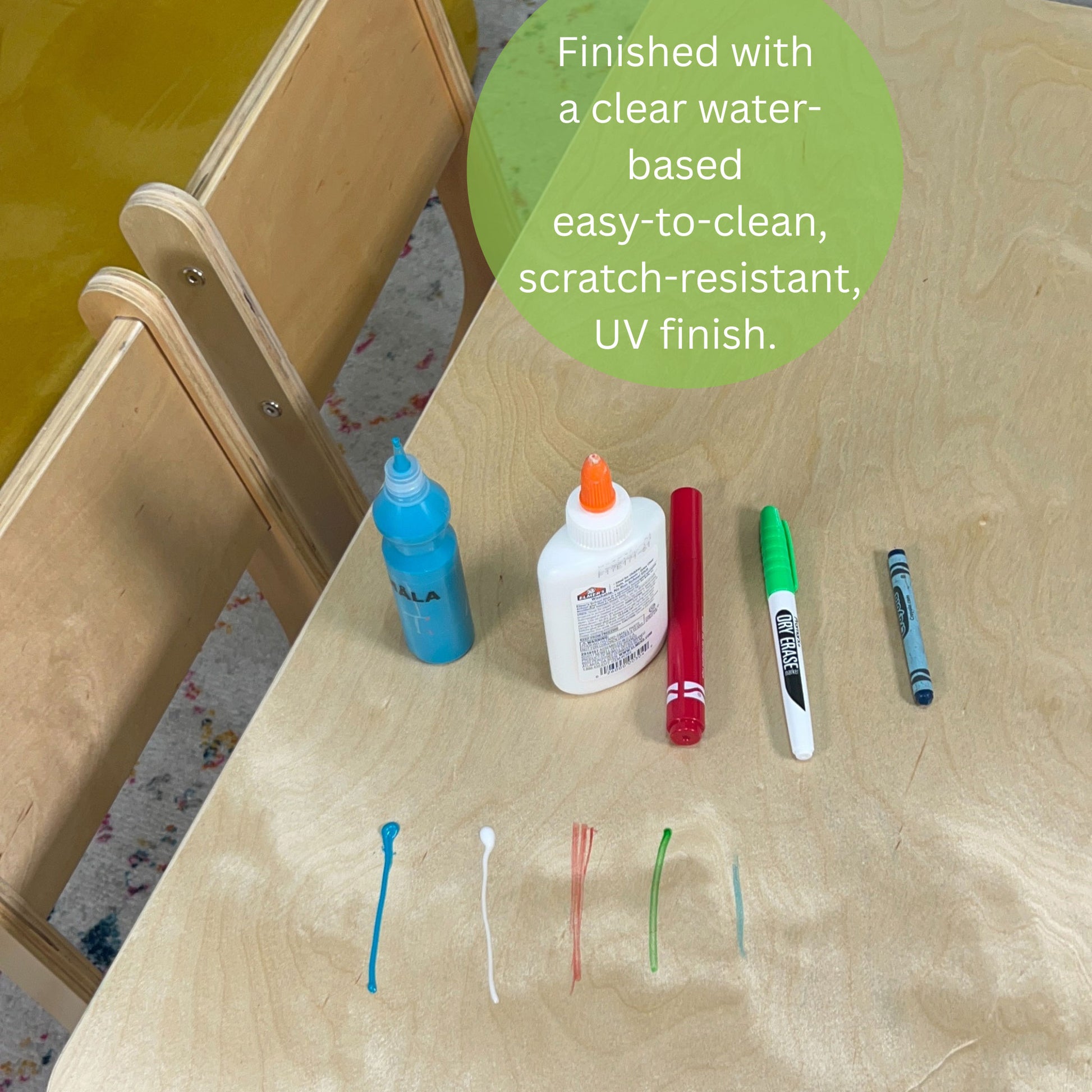 Crafted from premium Baltic Birch, the table and chairs are finished with a durable, waterproof clear coat that makes cleaning up art projects, snacks, and everyday messes simple and stress-free. Choose from 18" or 21" table legs to find the right height as your child grows.