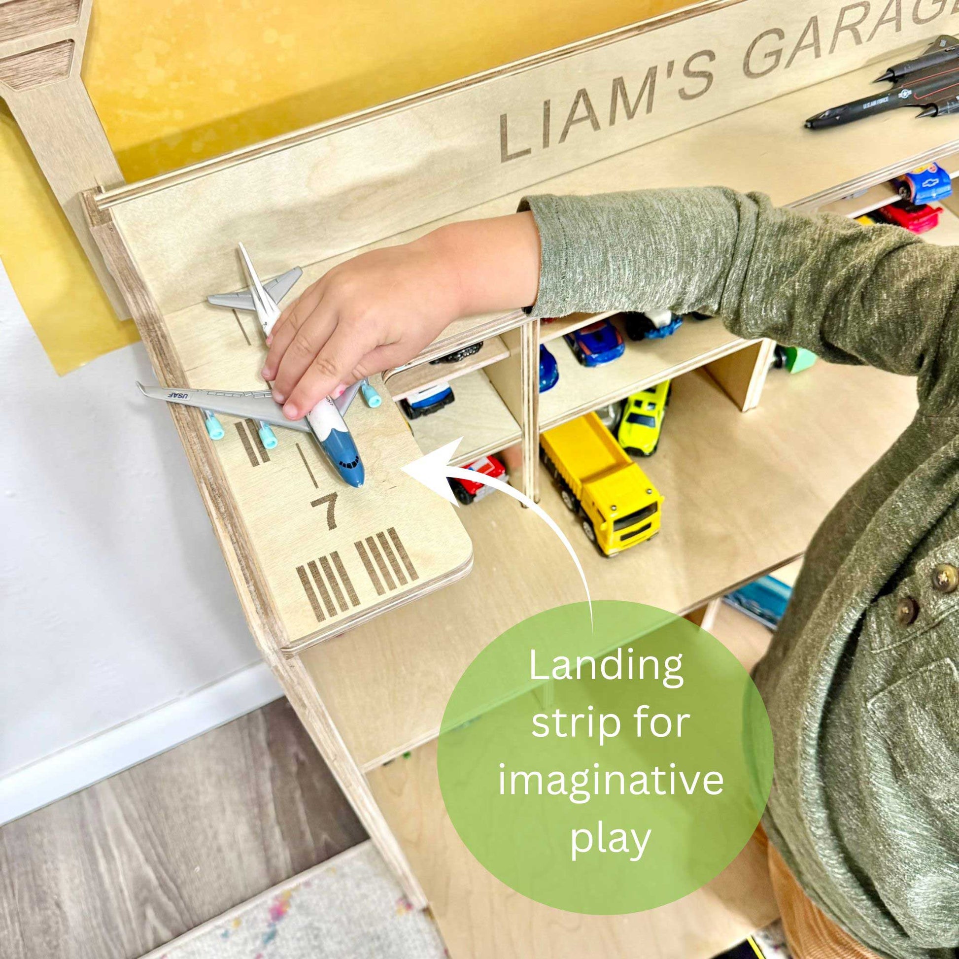 Each garage is crafted in our USA-based woodshop, using durable, child-safe materials and smooth, sanded edges for worry-free play. The movable car elevator lets kids transport cars between levels, encouraging fine-motor skills and hands-on exploration. Up top, a plane runway with control tower and helipad opens the door to endless pretend adventures — from takeoffs and landings to parking every plane in its spot.