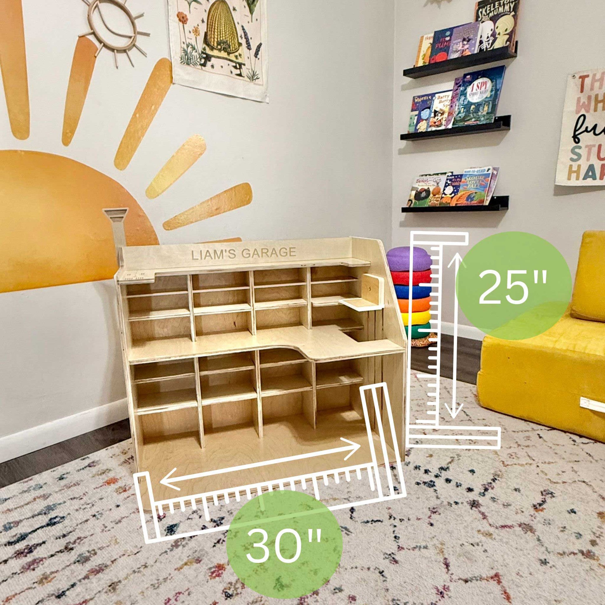 • Multi-level wooden toy car garage with storage for 100+ toy cars